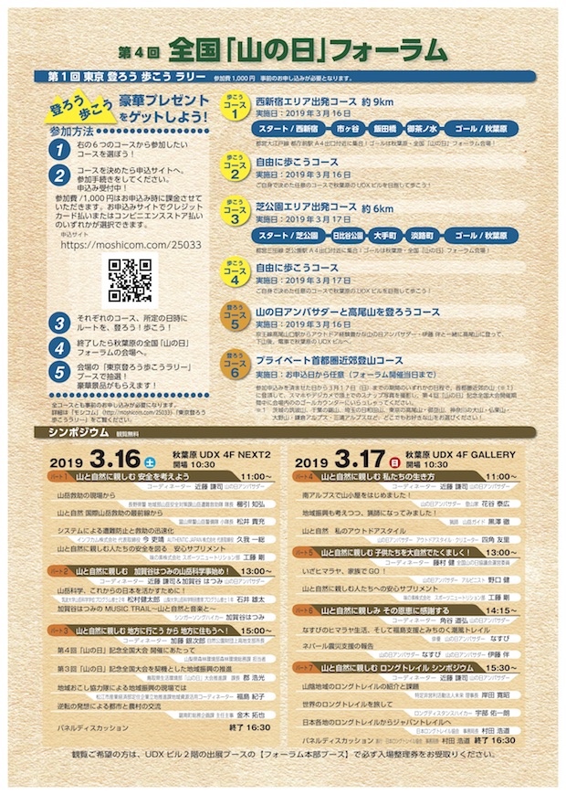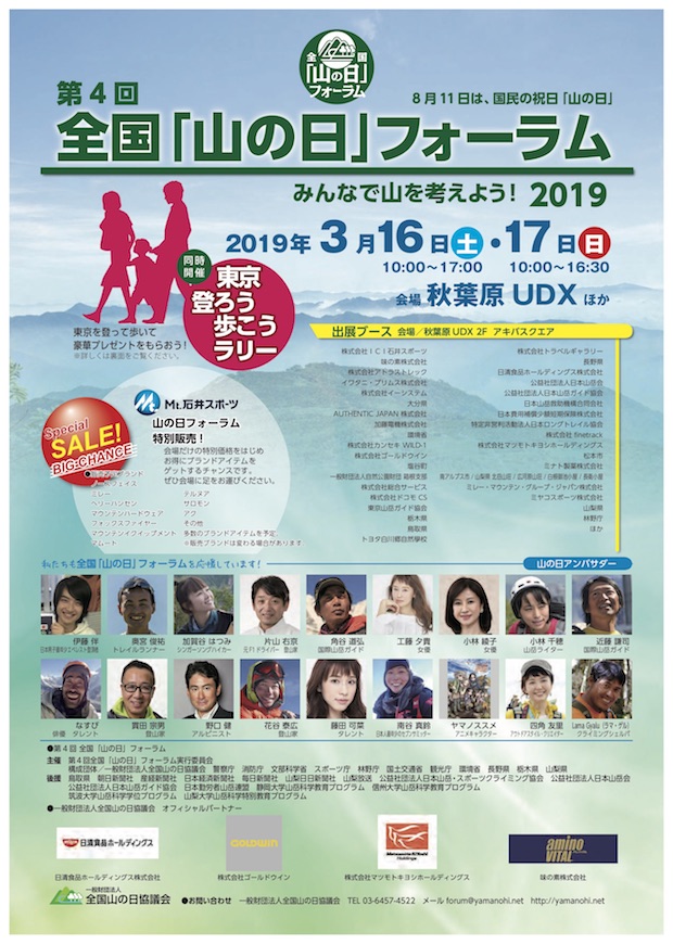 ということで、8月11日は国民の祝日「山の日」だってこと、ちゃんと思い出しましょう! 全国『山の日』フォーラム(じつは今年でもう4回目!!)が、3月16、17日の週末に秋葉原UDXで開催されます。「みんなで山を考えよう!」というなんともストレートな副題がついていますが、それも納得。出展ブースに並んだ名前をたどれば、大真面目に山のことを考えているフォーラムだというのがわかります。