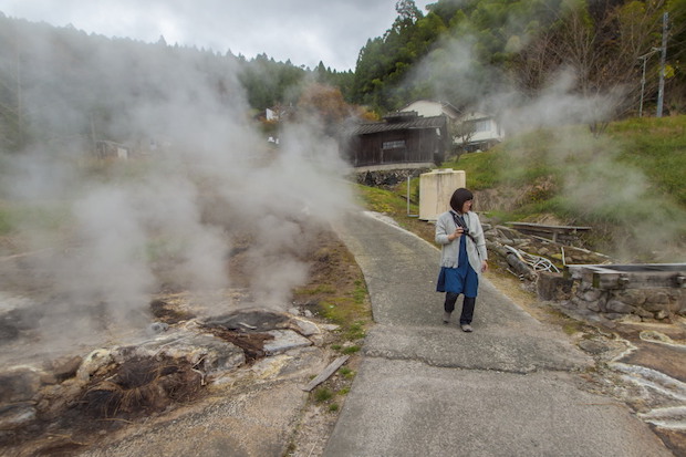 おすすめは涌蓋山の西面にある岳の湯。山肌の穴から、棚田の畔の割れ目から、民家の石垣の隙間から、とにかく集落のあちこちから蒸気が噴出していて、かなりインスタ映えする山里です。ここで湯浴みして、マグマの熱で蒸された料理をいただけば、地球パワーで元気満タンになることまちがいなし!
