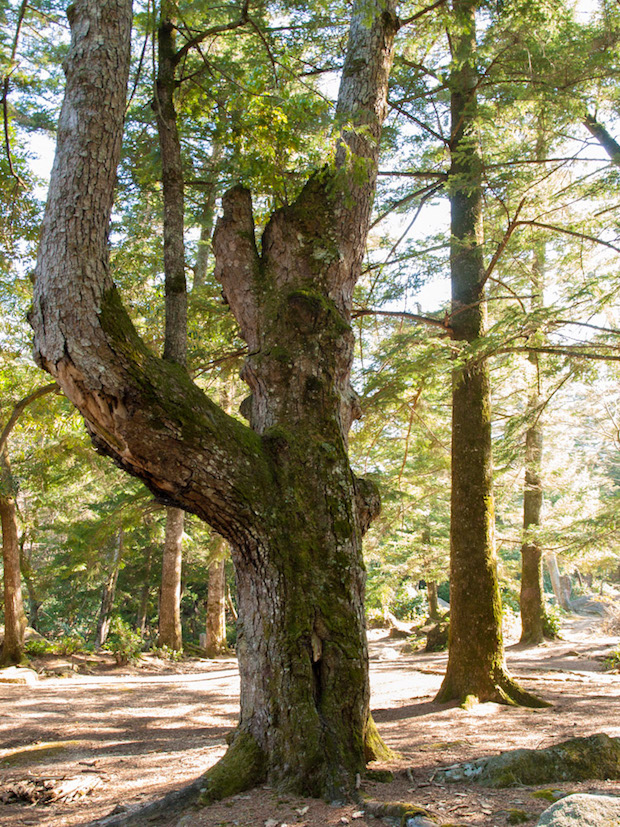 その樹種はモミやツガ。冷涼な山地で生育するはずなのに、海岸近くで大きく育っています。また、ミミズバイなど暖かな地域に育つ照葉樹も多い。亜熱帯系と冷涼系の木が混在する自然林は、瀬戸内海ではここだけでしょう。