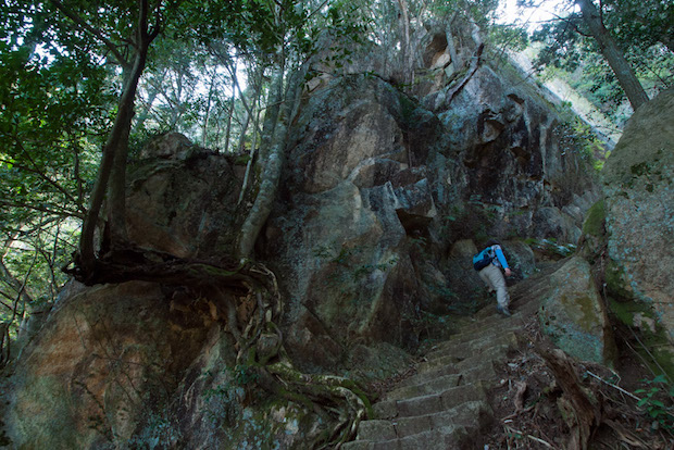 大元公園をすぎると、かつては修験者の姿もあったという谷を登っていきます。照葉樹が濃い影を落とし、冷たい巨岩が点在しています。のしかかるような岩壁もある。