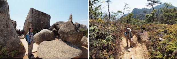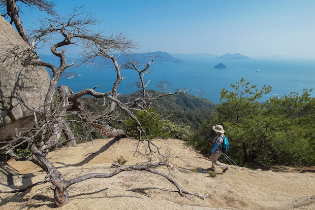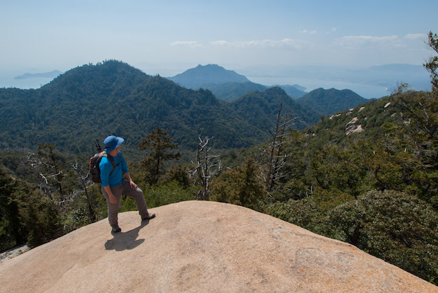 平日なのに人でごった返す弥山から尾根伝いに下山。花崗岩を主体にしているせいか、ルート上には大きな木があまり育たず、瀬戸内海の風が気持ちのよく吹き抜けていきます。気軽に登れる山なので、軽装の白人旅行者と何人かすれ違いました。「ハーイ!」とまるで外国の山のトレッキングみたいに挨拶。