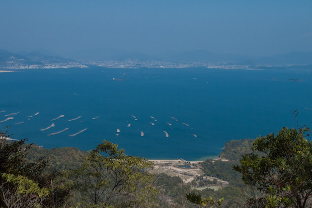 眼下に、包ヶ浦自然公園(海辺のキャンプ場)が見えてきました。太平洋戦争のときには日本軍の弾薬庫があったところです。その向こう、カキ筏浮かぶ瀬戸内海を挟んで約15㎞先に広島市街が見えます。そして少し右へと視線を振れば、私の生まれ故郷である呉市街が島々の間に。私の父は生前、「8月6日の朝、山の向こう、広島の街の方向に、大きな雲が昇っていくのを見た」と言っていました。宮島の神さまもあの惨事を目にしたはずです。