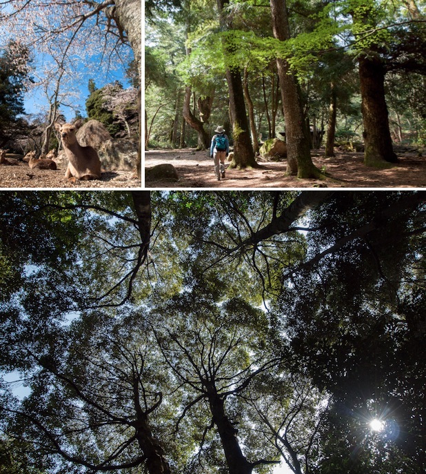 大元公園のシカは馴れ馴れしくないが、人を恐れることもない。静かに至近距離で撮影を楽しんで、まるで高山帯のようなモミの林へ。かつての修験者の道に入ると、太陽の光を貪欲に求める照葉樹が森を薄暗くした。