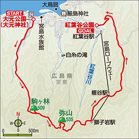 〈歩行計=3時間45分〉大元公園(1時間30分)駒ヶ林(30分)弥山(30分)獅子岩駅(15分)榧谷駅(1時間)紅葉谷
