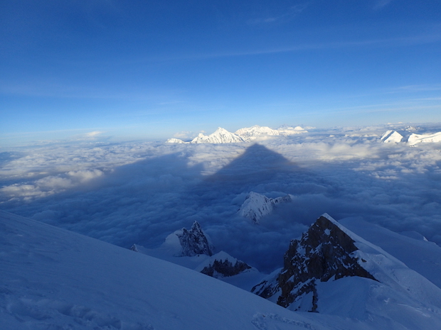 2年越しの思いを叶えたマナスル登山。雲海に浮かぶのはマナスル山頂の影。photo by Kyoko Iwata