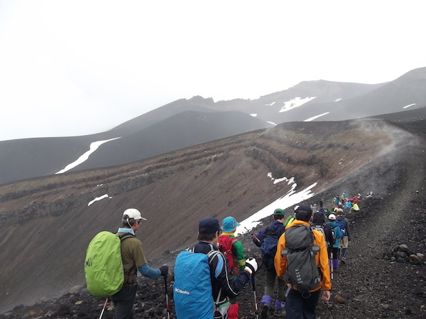 二日目はみんなでお弁当を持って十勝岳のスリバチ火口まで登山。もちろん講師も一緒ですから、前日に学んだことを実地確認できるというわけです。んでもって山でご飯を食べてお茶を楽しんだら、またしても温泉タイム!