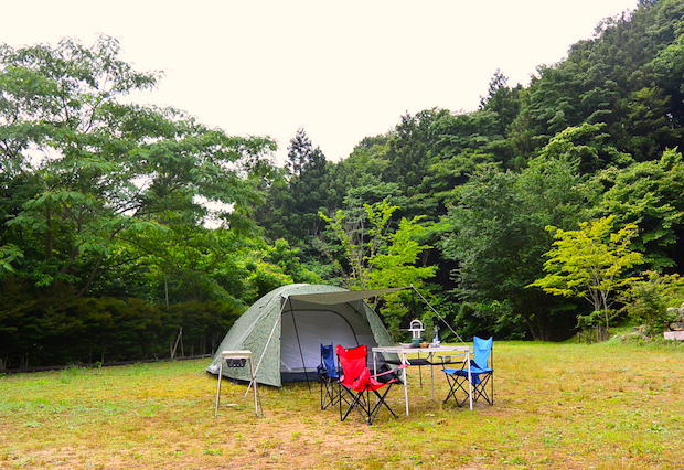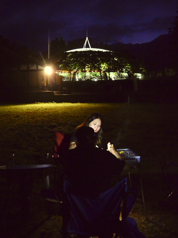 霧がたちこめ、ますます幻想的な様相を呈する東平を後に、今夜は新居浜市にある別子山森林公園「ゆらぎの森」でキャンプの予定です。一路、車でキャンプ場をめざしますが、途中のんびりしているうちにすっかり、夕暮れ近くになってしまいました。でも心配ありません。今回はキャンプ道具も食料も自分で用意する必要がない、「手ぶらでコミコミキャンプ」というプランです。これは、遠方から来るキャンプ好きの旅行者に、とても便利なセットプランで、テントからマット、寝袋、イステーブルなどのキャンプ用具一式と夕食のBBQ、そして施設内のレストランでの朝食が、すべてセットになった楽ちんプランです。