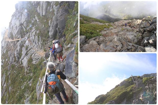八本歯のコルからは稜線を少し歩く。今までは上をめざしていたから、自分たちが高いところにいるという実感は少なかったのだけど下が見える。山の傾斜をトラバースしている道もある。そんな場所など、ちょっとでも気がぬけて道を踏み外してしまったのなら、滑落してしまうかもしれない。風も強くなっているし、自分に叱咤激励しながら歩いた。