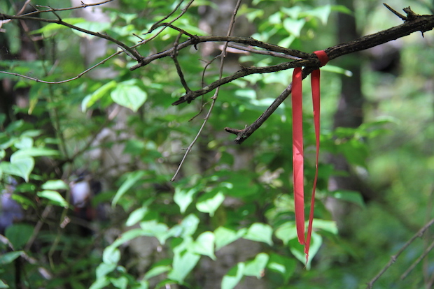 小枝や岩に記された「赤」の目印。ここがルートだと教えてくれる。