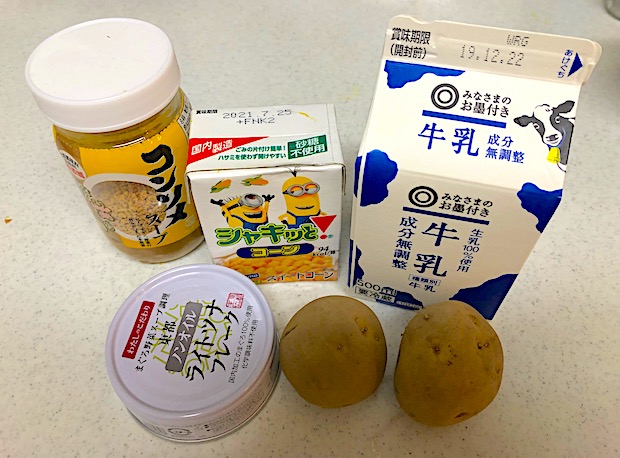 材料はこれだけ。好みで片栗粉でとろみをつけても良い。ジャガイモはスープジャーの中で保温調理されるので、完璧に煮込まなくてもOK。