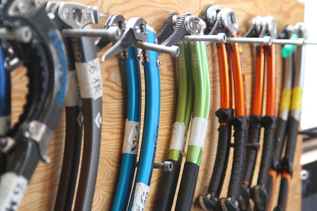 アイスクライミングの専用ギアはおおまかにアイスバイル、縦爪アイゼン、アイススクリューがあるが、体験する、ということであれば、アイススクリューはいらないし、アイゼンは12本爪アイゼンがあればアイスクライミングができます。