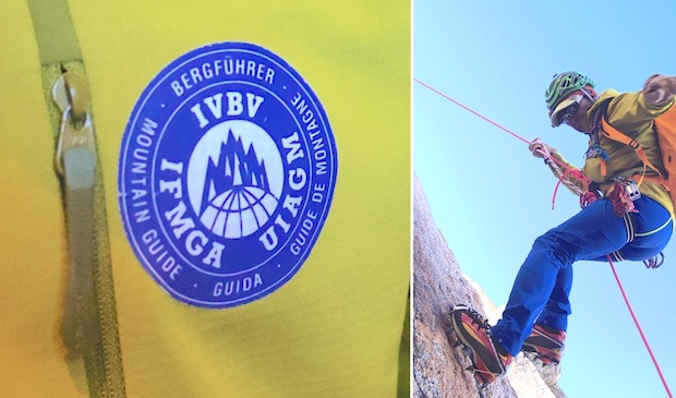 モンブランをガイドするには国際山岳ガイド連盟のライセンスが必要だ。近藤さん(右)が着ているジャケットの胸に張り込まれているワッペン(左)がその証。IFMGA(英語)、UIAGM(フランス語)、IVBV(ドイツ語)は「国際山岳ガイド連盟」を表記した各国語の略称。本部はスイスにあり、日本国内では日本山岳ガイド協会がライセンス認定の実務を負っている。