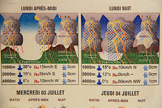 LUNDI APRÉS-MIDI(月曜日の午後)もLUNDI NUIT(月曜日の夜)もご覧の通りの大嵐。まるでモンブランの山上でゴジラとガメラが争いを始めたかのごとき凄まじき雷と雲。表現法に、しばし唖然となる。これ、ホテルのフロントに掲げられる毎日の天気予報で、フランス気象局の情報を元にしている。それにしても、これでは望みの欠片もありはしない。なんと無慈悲な……涙。