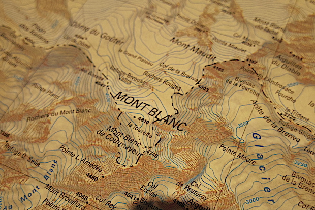 4,810m。ヨーロッパアルプスの主峰は、地図の中でさえ堂々としている。条件さえそろえば山中1泊で登れるはずが、その山頂は遥かに遠く。いちばんメジャーなルートは、フランス側のドーム・デュ・グーテを経由する。
