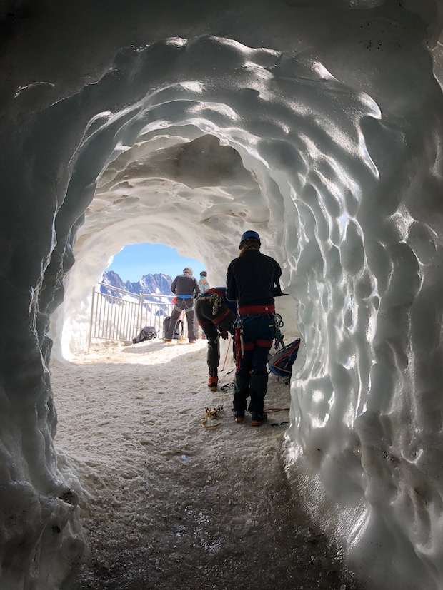 エギューユ・デュ・ミデュの山頂駅から先、外の氷河世界へと続くALPINIST ONLYの氷のトンネル。ここを抜けた先は、アイゼンとピッケル、ハーネスにロープの世界。