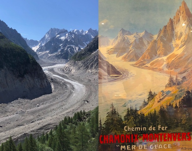 シャモニで泊まっていたホテルで見つけた昔のメール・ド・グラスのポスター。いつの時代のものかはわからなかったが、ほぼ同じ場所と思われる位置から撮った写真を並べてみた。もはや一目瞭然。氷河の後退は止まることを知らないようだ。