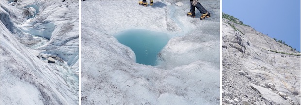 氷河の底に降り立ってみると、どこもかしこも融解が進み、ズタズタの状態になっている。いちばん右の写真は、降りて来た岩壁を下から見上げたもの。その昔はここからあのスカイラインの位置まで氷河で埋まっていたのだろうが、もはや想像すらできない。