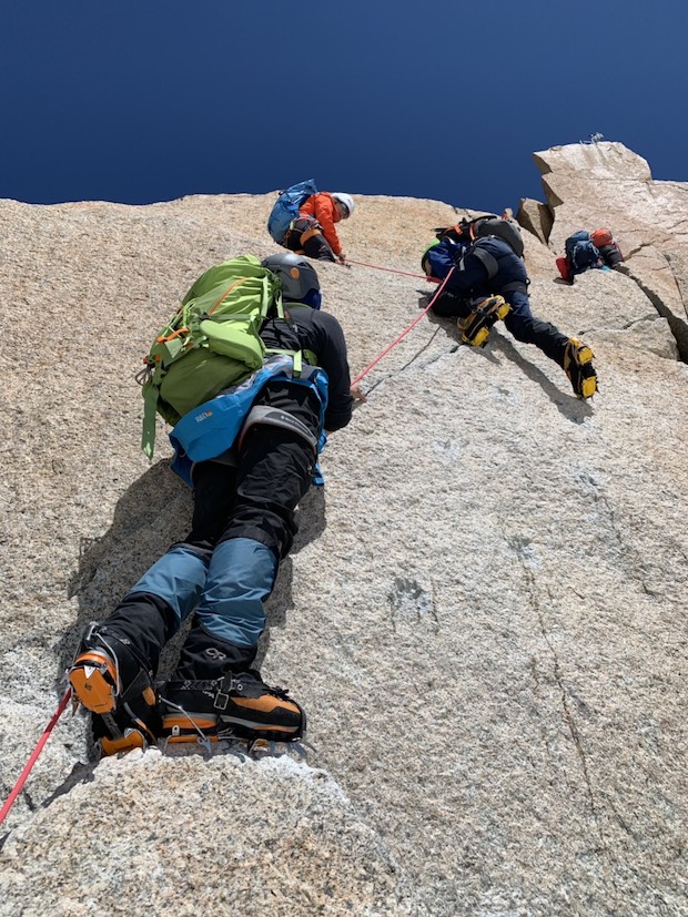 ほぼ垂直に天を突く花崗岩の壁を、首が痛くなるほどに見上げていた。青い空に荒々しいスカイラインを刻みながら、いくつものピナクルが頭をもたげている。そのひとつにへばりついていた。足元は氷と石塊。いわゆるミックス状の岩場でスパッと切れ落ち、氷河の底まではかなりの距離がある。ていねいな足運びを心掛けつつ、アイゼンの爪を窪みに引っ掛ける。腕を伸ばした先のでっぱりを掴み取り、バランスを整えながら身体を引き上げていく。緩慢ではあるが、ひとつひとつの動作に意識を集中させ、確実に手を足を動かし続けていた。