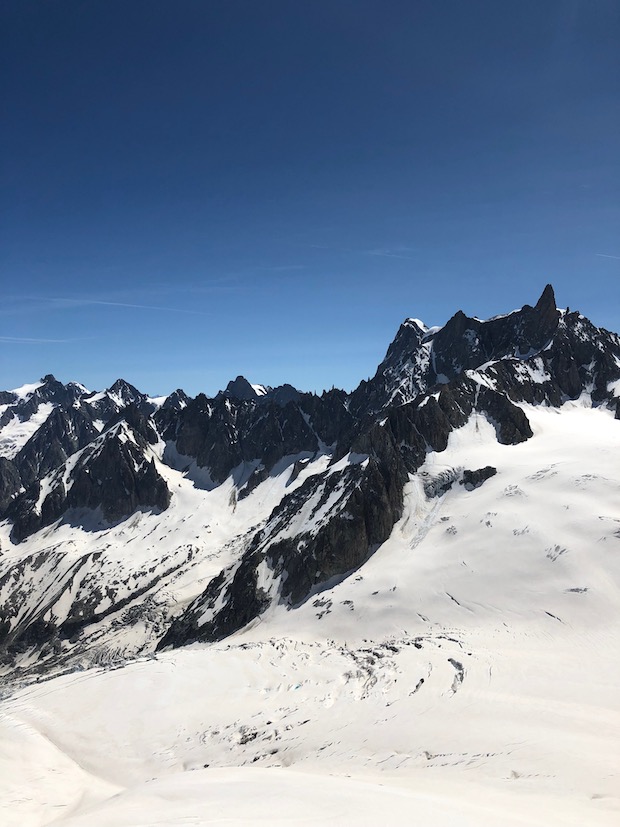 現地到着から初日の行動は、山上の氷河で高所訓練。エギューュ・デュ・ミデュからエルブロネへ、氷河上をロープウェイで空中散歩。ジュアン氷河の一角で、フランスからイタリアへと国境を越える。目の前には、巨人の歯(ダン・デュ・ジュアン)とも呼ばれるエギューユ・デュ・ジュアンの岩峰が大きく立ちはだかり、その奥にはあのグランド・ジョラスが見え隠れしている。振り向けば、モンブランの丸い稜線がすぐそこにある。いままで空想の中で思い描いてきた情景だけに、ここに身を置いているだけでもしぜんと口元が緩んでくる。