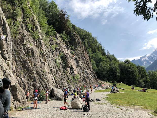 ガイアンの岩場はシャモニの街からバスに揺られて15分ほど。バス停を降りたすぐ先に、あつらえ向きのゲレンデがどどんと現れる。あまりにもでき過ぎの岩場に、ヨーロッパアルプスの山岳環境の奥深さを見た気がした。平日だというのに、子どもたちもたくさん。なるほど、本場のアルピニストはこうやって育てられるようだ。