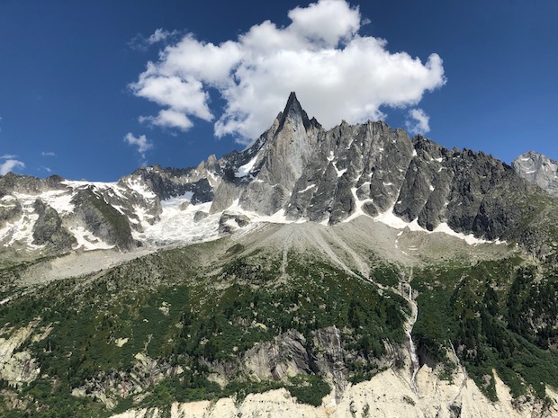 モンタンヴェールの駅を出ると飛び込んで来るのがこの景色。ドリュ西壁が真正面に見える。壁面が大崩落し、かつての登攀ルートは登れなくなってしまったという……写真映像でしか見たことのなかった山がいま目の前にあるというのは、やはり興奮と喜びを呼び起こす。