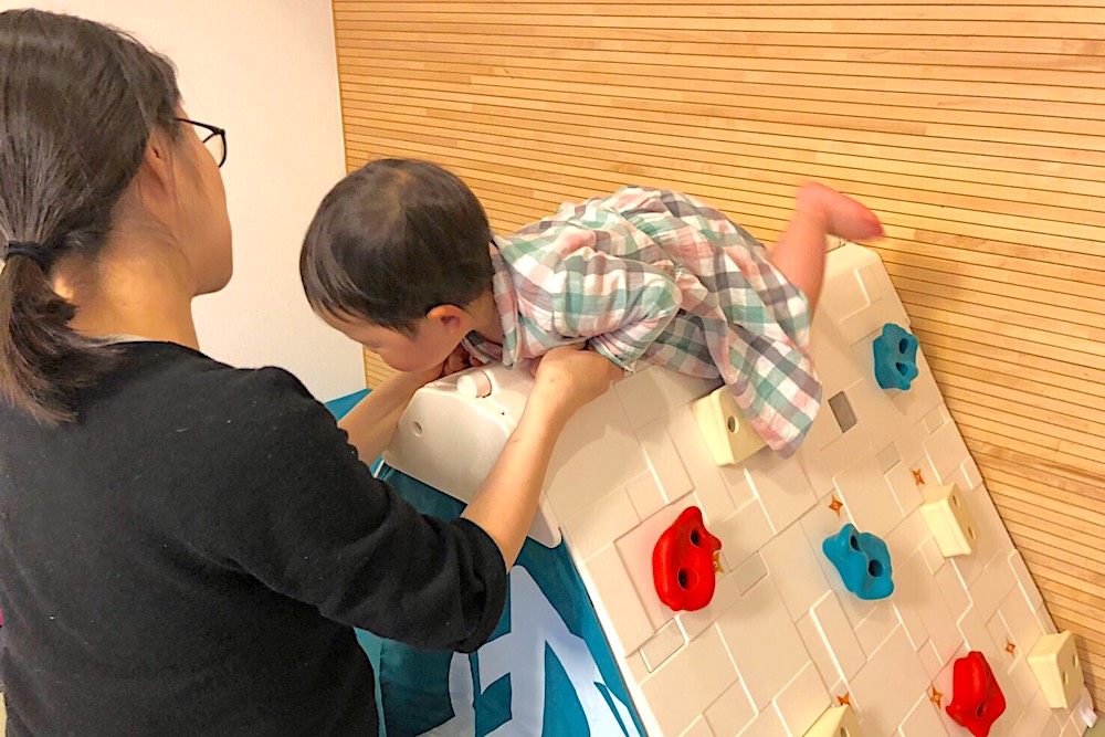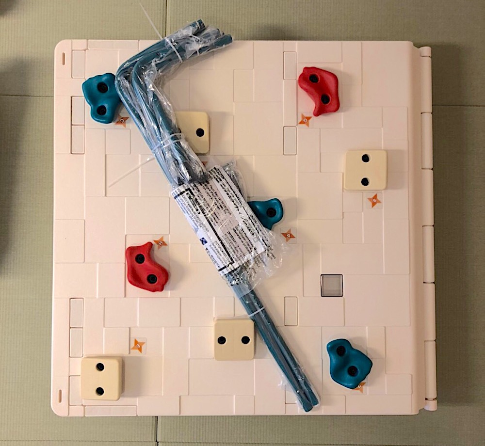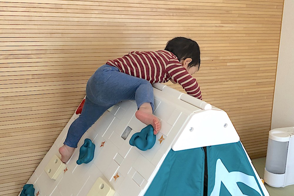 忍者……? と聞くとマニアックな印象もあるかもしれないが、「ヒローズアップ! クライミングクラブ」を開催するボルダリングインストラクターの太田裕樹さんがしっかり監修に入ってる本格派。ちゃんとルートも計算されている。早くボルダリングをやらせてみたいけれど、ほとんどのジムは小学生からなので、うずうずしていたわれわれ夫婦には、まさにぴったりな遊具だ。