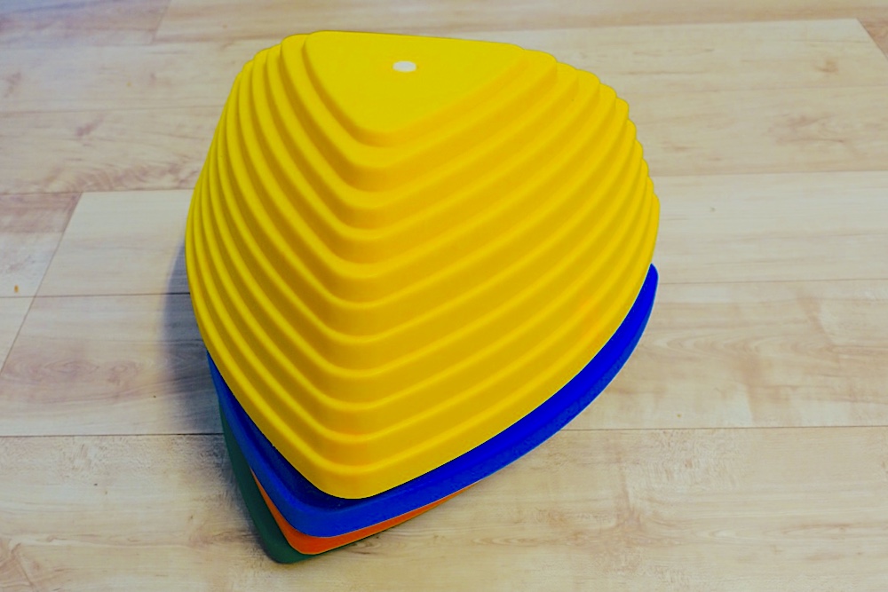 まず、足裏への刺激が変化に富んでいること。三角形を段々に重ねたような形状なのだが、三面とも傾斜の緩急が異なるので、足を置く面によって足裏への刺激が変わってくる。頂点をうまく渡り歩くだけではなく、斜面に足を置いて「おっとっと!」とバランスをとるだけでもいいトレーニングになりそうだ。