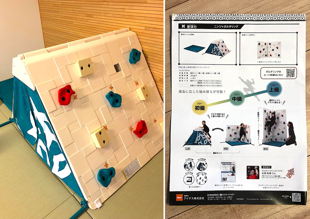 こちらは、日本全国の忍者が参加する団体である「日本忍者協議会」が公認する、忍者の修行道具「ニンジャスポーツトイ」シリーズのボルダリングウォール。
