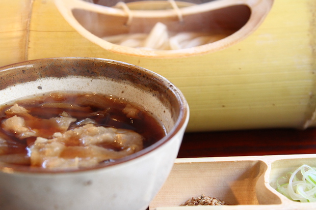 肉汁釜揚げうどんは、風情ある竹の入れ物に盛られたあたたかいうどんに、肉の出汁がよくしみているつけ汁につけて食べるつけ麺タイプのうどんです。いちばん人気というだけあって、お肉もうどんもめちゃめちゃおいしくて、人里から少し離れた場所にあるにもかかわらず、このうどんをわざわざ食べに来る人が絶えないのもうなずけます。