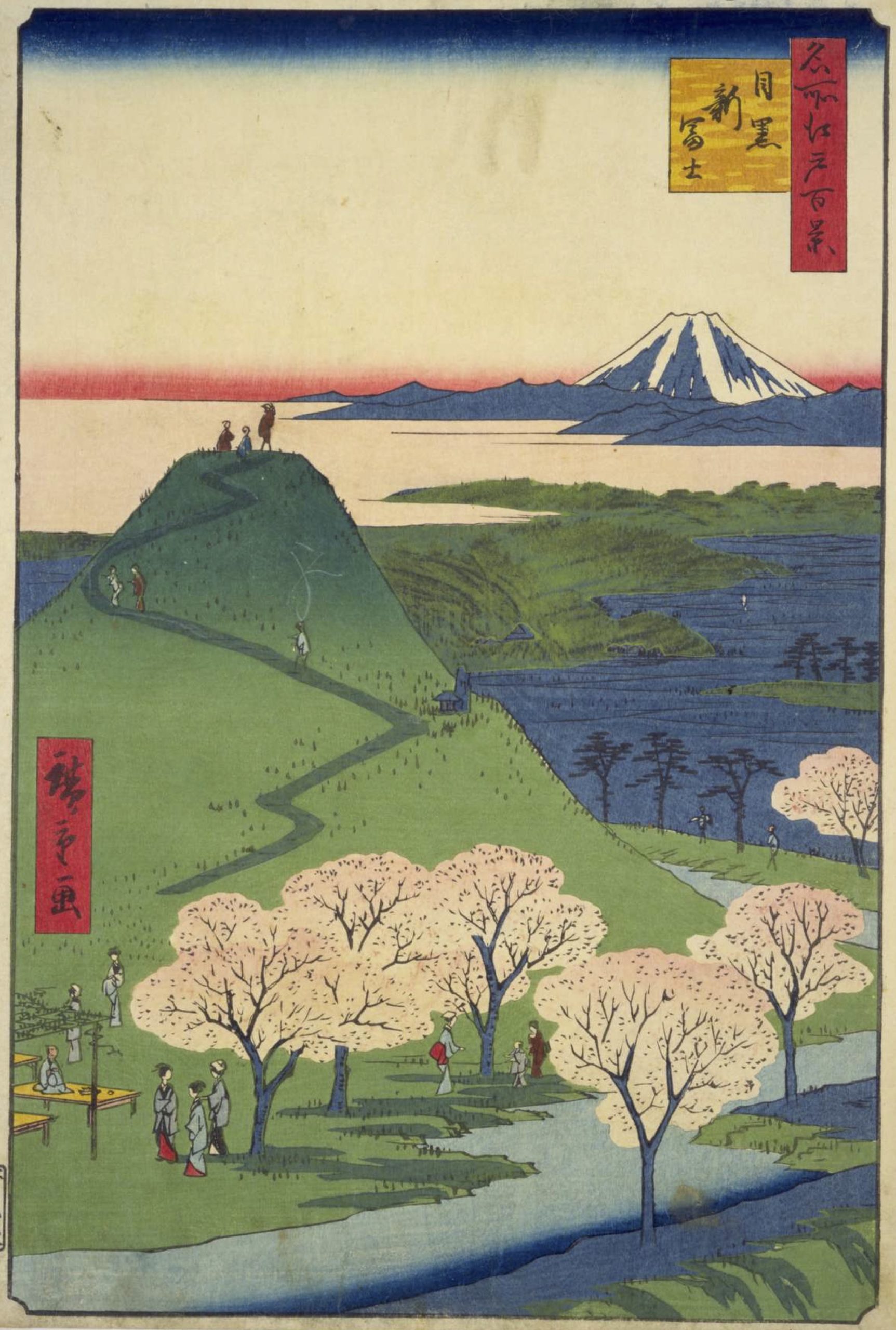 歌川広重の浮世絵にも描かれた目黒富士の富士塚で富士登山を楽しむ人たち(名所江戸百景)。遠くには富士山を望むこともできる。