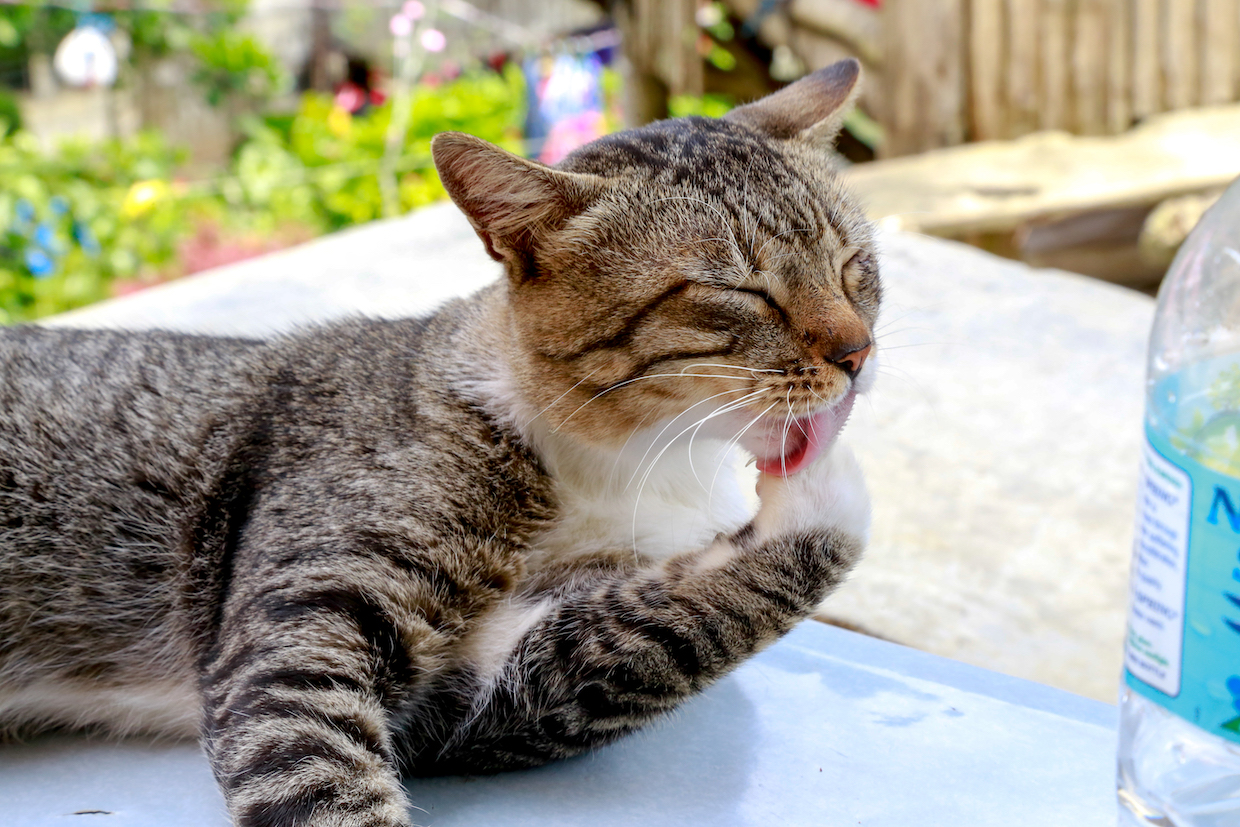のんびり足を舐めまわすかわいいねこちゃん。ここでは、ねこもニワトリも牛も人間もストレスなく生きているんですね。