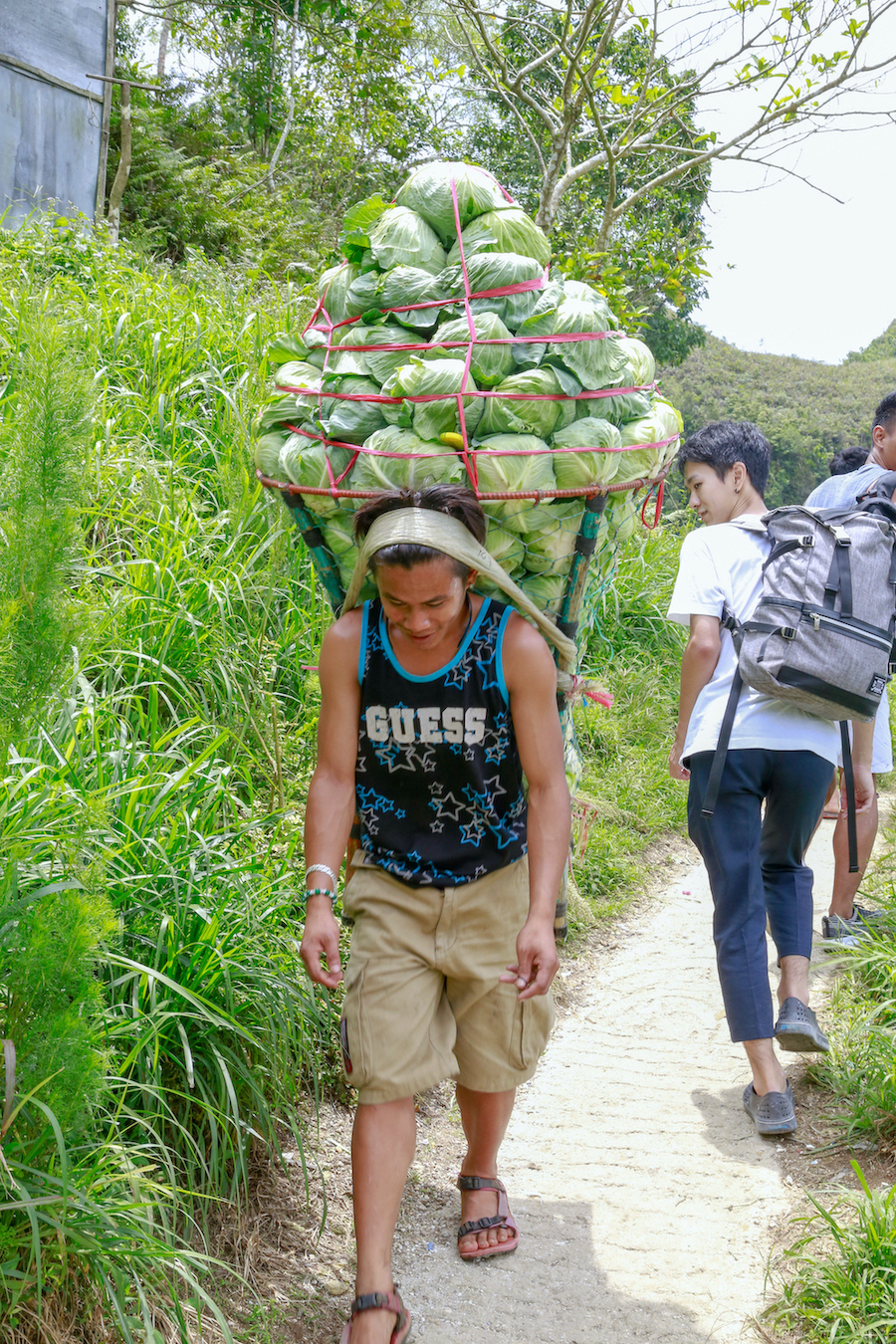 キャベツをカゴに入れて運ぶお兄さん。広い道に出たらトラックかなんかに乗るんだよね? まさかずっと歩いて里まで降りないよね? と不安になるくらいの山奥にて。