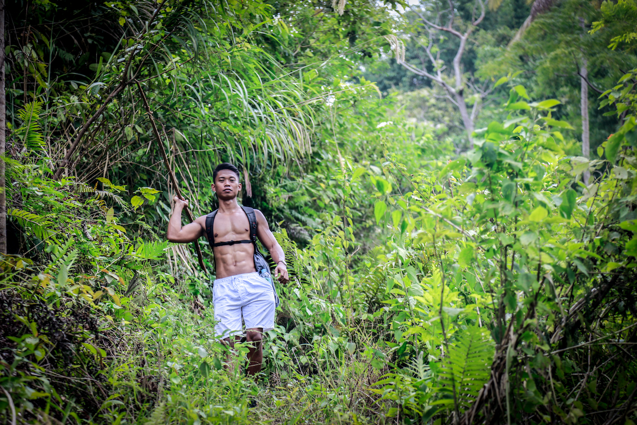 いっぽう、ジャングルになってテンションが上がったグレンは上裸になって槍っぽい枝を手にし、野生児ごっこをはじめました。当時セブシティのジムで働いていたので腹筋がバッキバキ。カメラを向けると脱ぎがちな彼は、いまは日本で働いています。