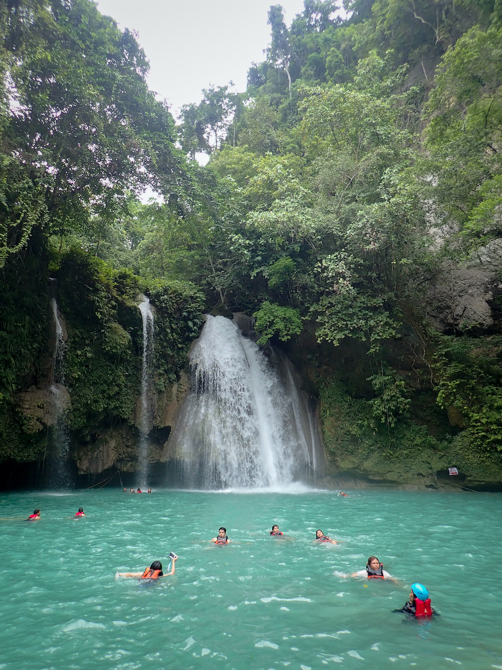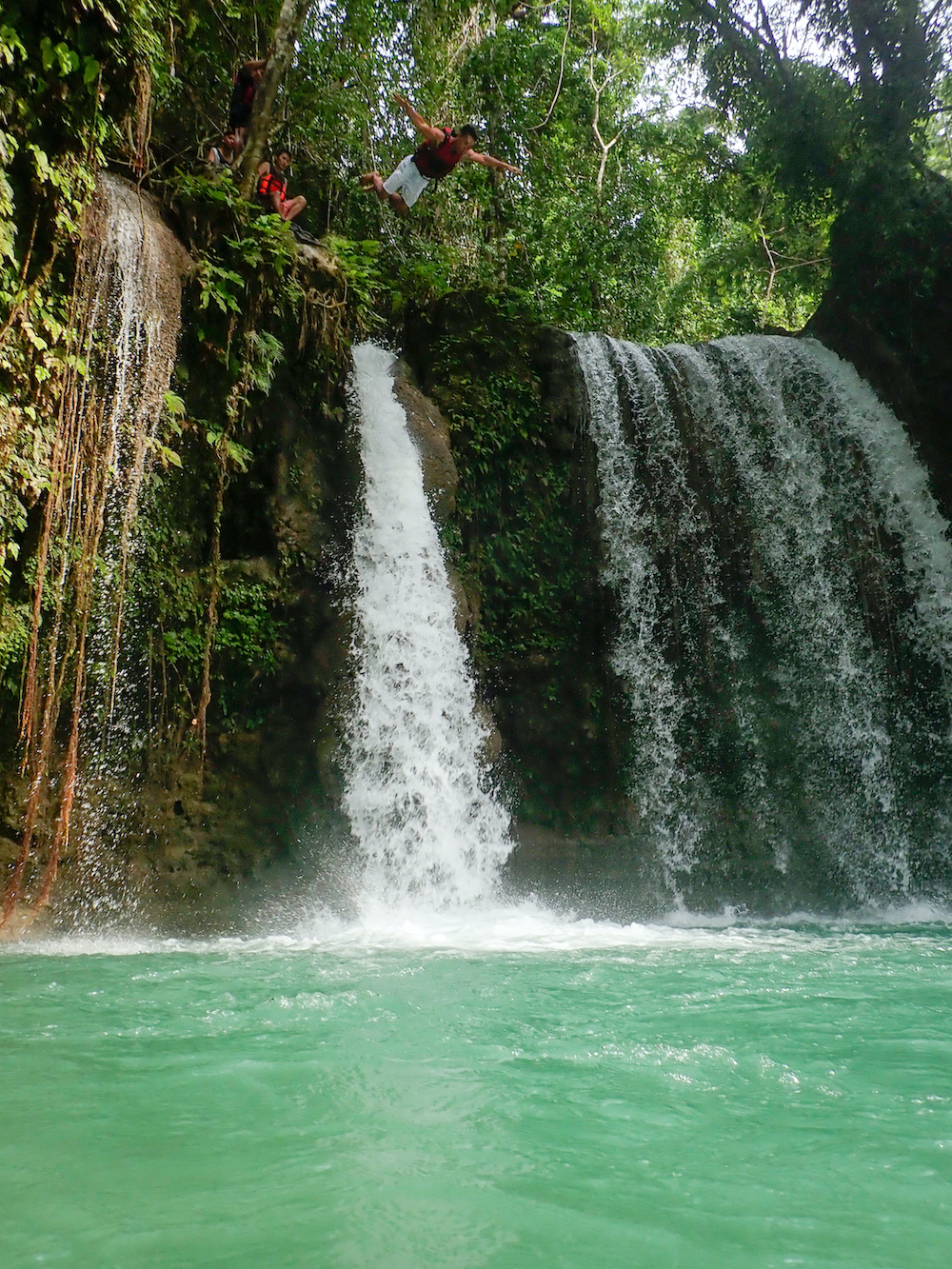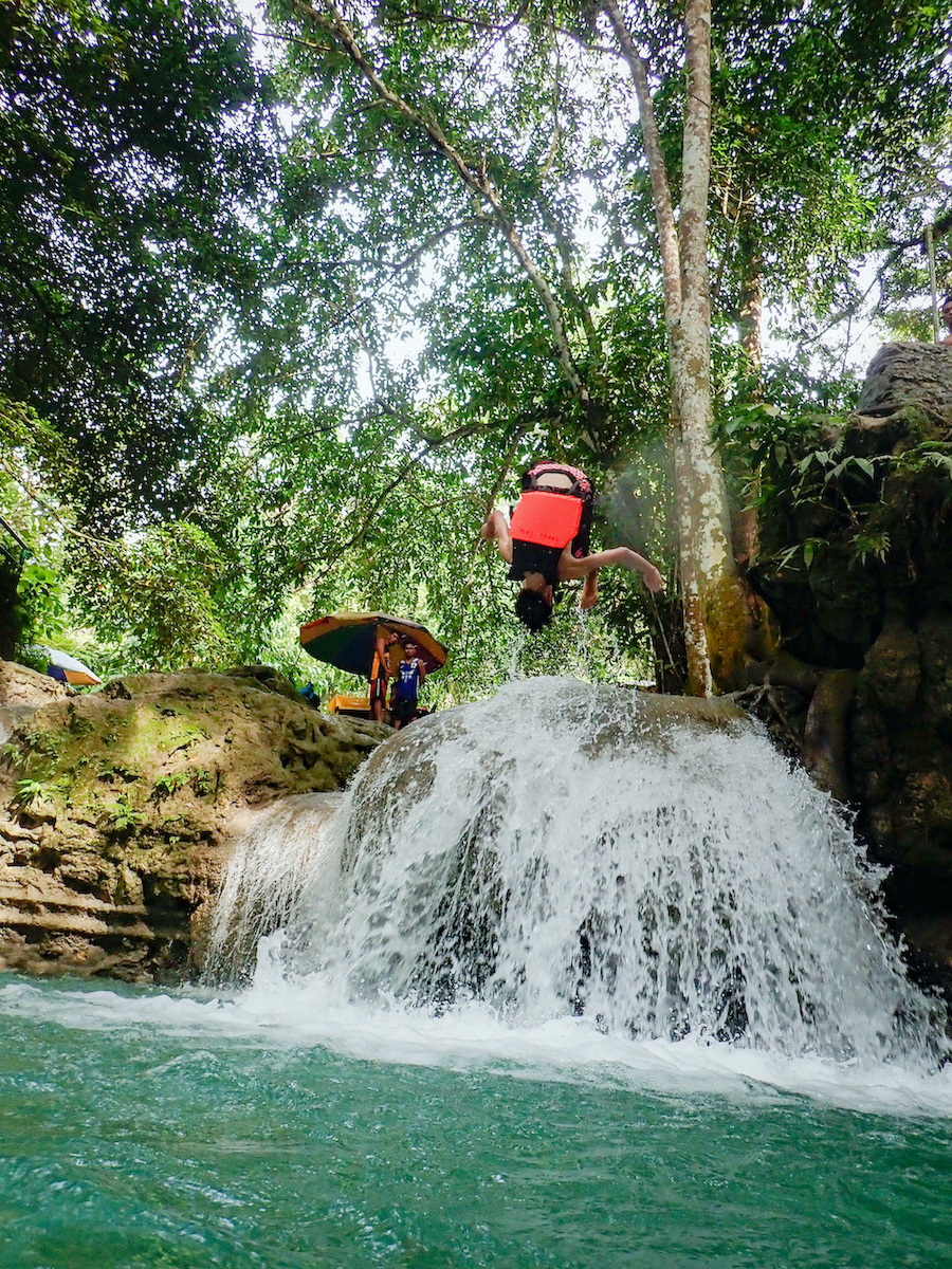 手はじめにライフジャケットを借りて、滝壺がつくり出したプールで水浴びをはじめました。第一滝は飛び込みが禁止されていますが、足がつく深さで子どもたちが多い印象。ただ水温が低めなので、徐々に慣らしていかなければなりません……。ちなみにこの滝の高さは40mで、セブ島の最大落差の滝だそうです。