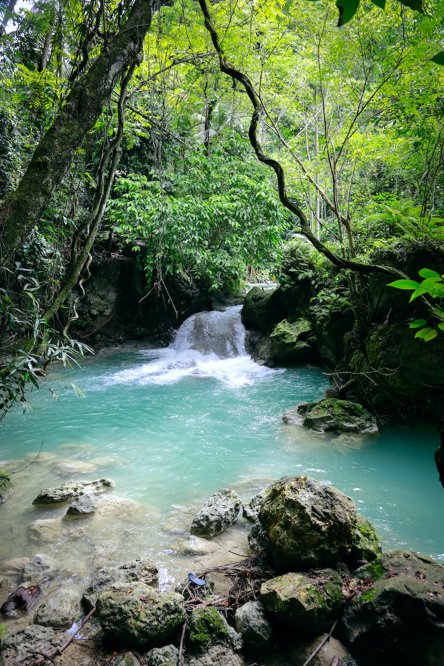 いよいよジャングル感が増して来たころ、遠くで水が流れ落ちている音が聞こえ、木立の隙間から水面が見えてきました。ターコイズブルーに輝く川はまるで宝石。長時間かけて歩いて来た甲斐がありました。案内ありがとうジャック君!!