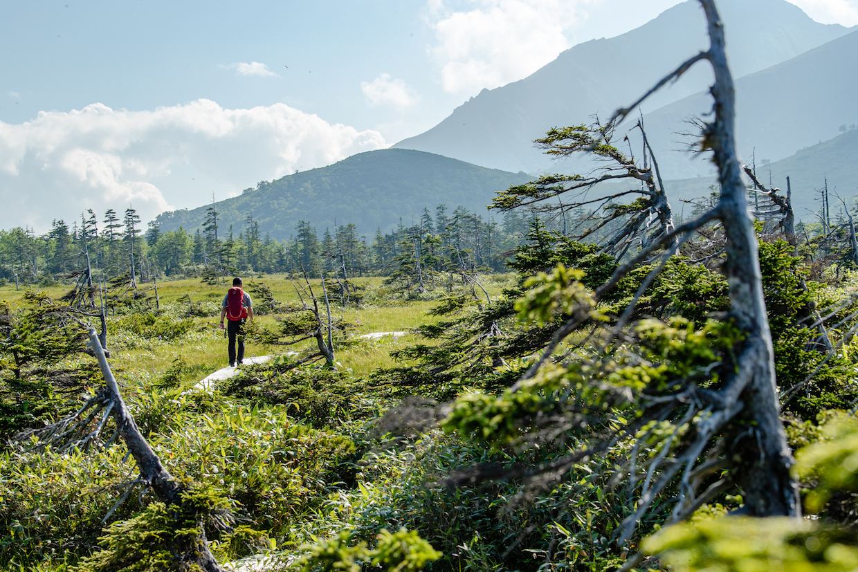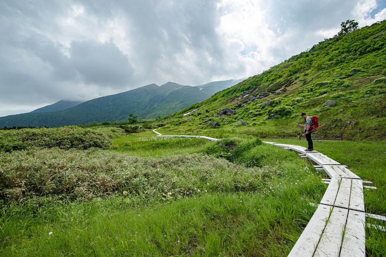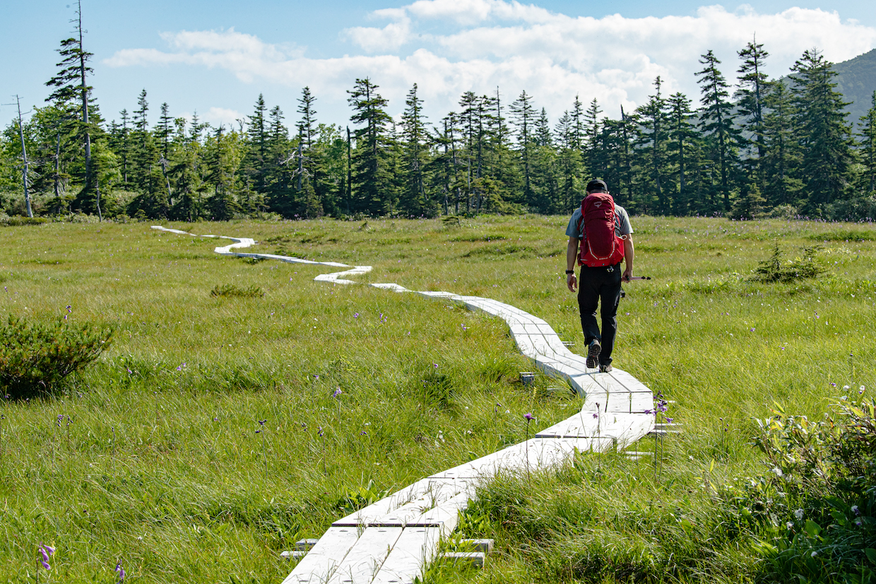 この松仙園ルートはここ最近、SNSでも話題となり、北海道ではいまいちばん注目のルートとなっている。山頂はひとつも踏まないが、すばらしい景色の湿原の中、整備された歩きやすい木道を歩くルートは、思い立ってすぐに行ける山歩きとして最高だ。とくに女性へおすすめで、景色を楽しみながらのんびり歩ける、まさにトレッキングにふさわしいルートである。