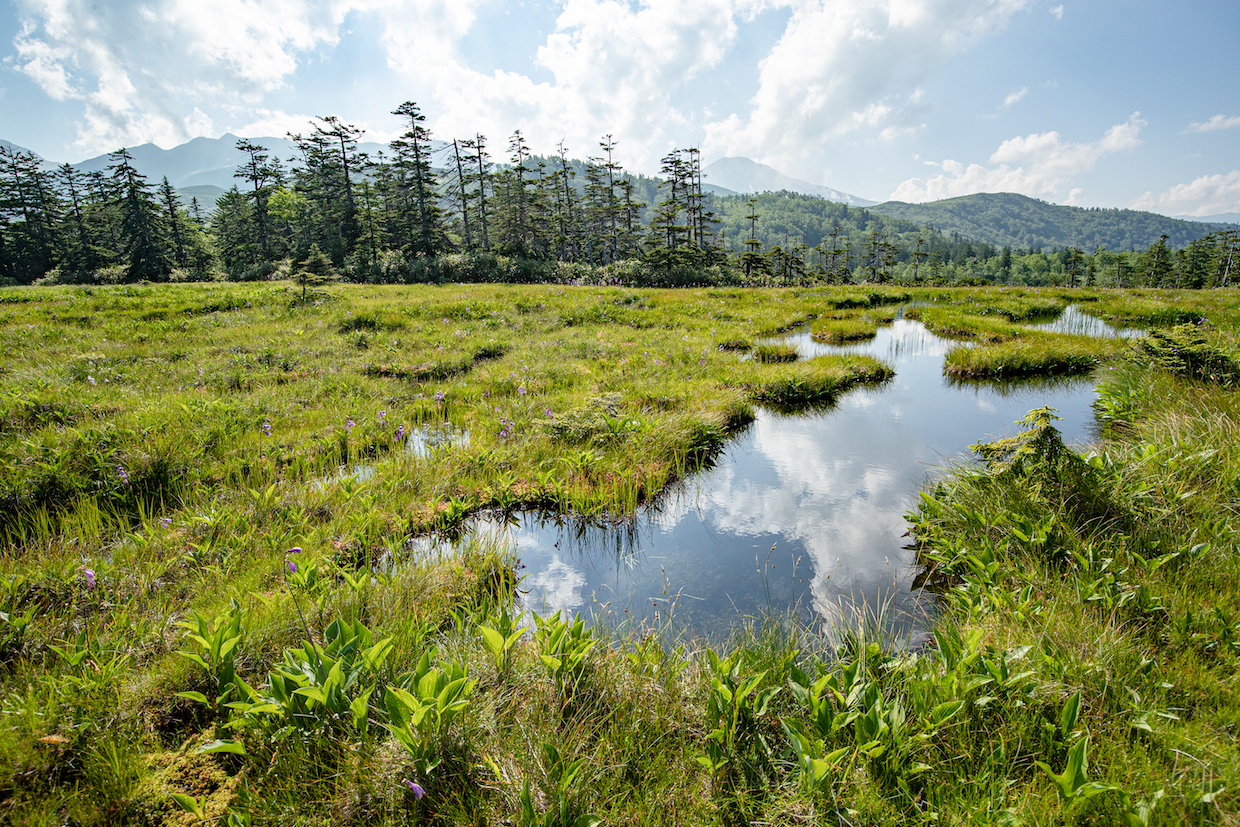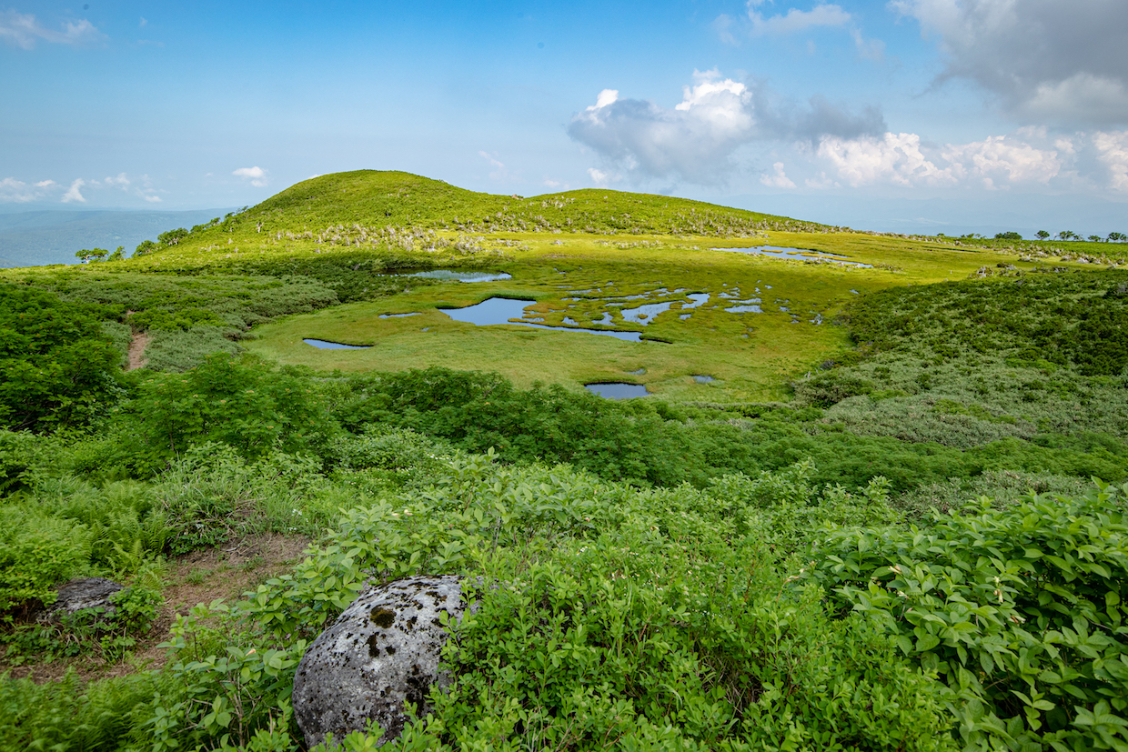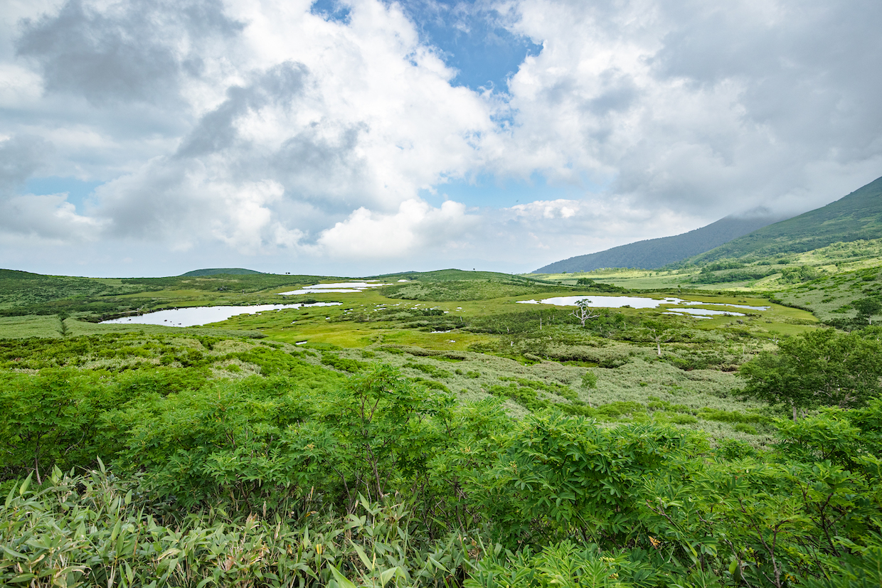 一ノ沼。溶岩台地の上に広がる湿原。湿原特有の植物が咲き乱れている。