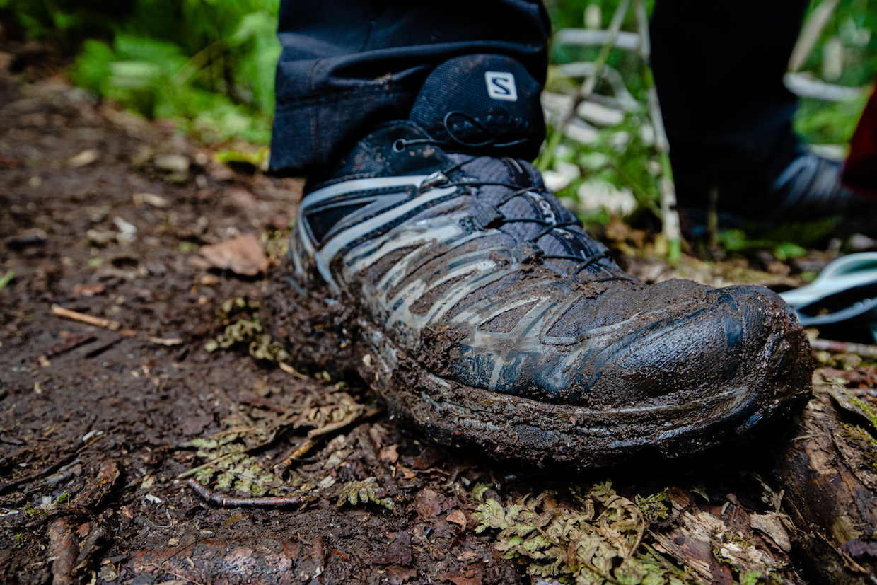 足元はサロモン(SALOMON)のローカットシューズ「X ULTRA3 GTX」。土のトレイル、岩場、ぬかるみ、木道、ガレ場など、どんな状況の路面にも万能でしっかりとグリップする。つま先のプロテクトが強く、ソールにシャーシも入っており、岩の突き上げから足裏を守る。サロモンが誇るテクニカルハイキングシューズだ。かためのソールで、日帰りはこれさえあればという感じである。最強のローカットシューズ。