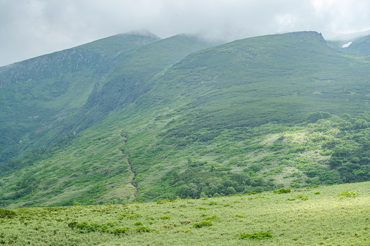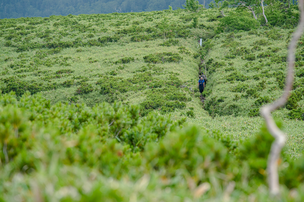 さて、ここから松仙園の出口となる八島分岐まではコースタイムで30分。八島分岐から三十三曲経由で愛山渓へ下山するルートだ。ここからも多少のアップダウンはあるものの歩きやすい木道が整備されている。どこまでも歩きやすいルートだと関心しながら歩いていく。愛別岳方面の山並みも近づいてきて、もうすぐそこに見え、永山岳の稜線やそこへと続く銀名水へのトレイルも肉眼で見える距離まで近づいてきた。