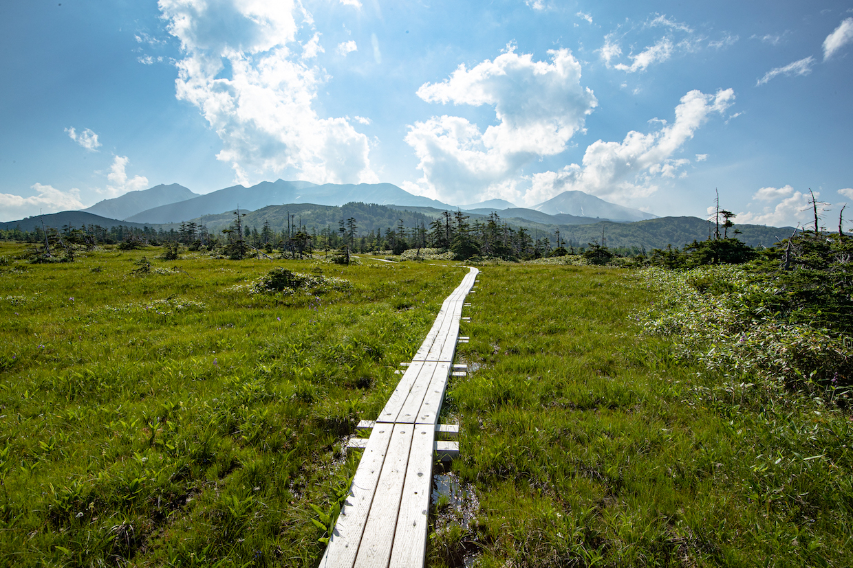 休憩や撮影をしながら歩くこと50分。イッキに視界が開ける。遠くには愛別岳や永山岳の稜線が見え、気持ちが上がっていく。湿原を抜ける風が心地よくきれいな高山植物が咲き乱れる。午後からは雨の予報であるが、いい感じで晴れており、まだまだ天気はもちそうだ。自然と笑みがこぼれる。