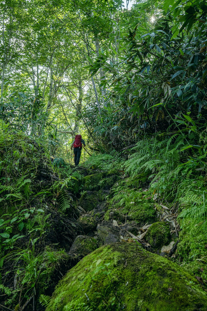しばらく人が入っていなかったため、登山等はシダやコケなどで緑が多く幻想的。