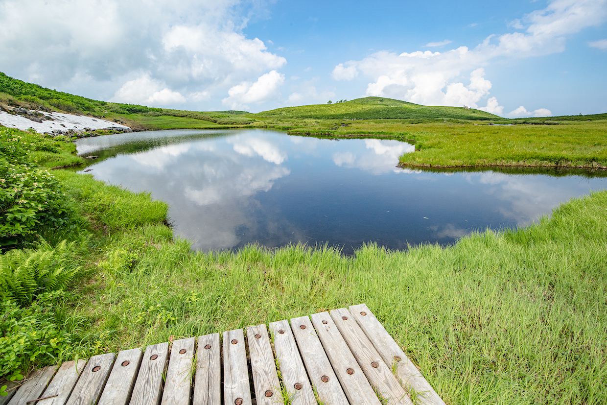 八島分岐からは半月ノ沼、五ノ沼と沼が続く。下界では30℃ごえのうだるようなあつさとなっているが、山の中は涼しく、水場も近いこともあり、すがすがしい風が吹き抜けている。沼のほとりにくると風がきもちよくてついつい立ち止まってしまう。ただ、時間はまだ10時前。急ぐ理由はなにもない。こころのままに長居したってかまわない。