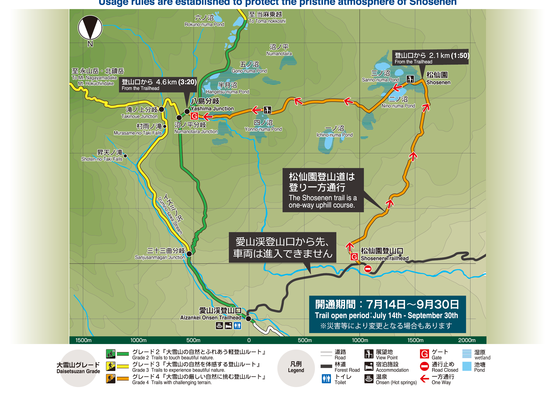 コースについてもルールが設定されており、基本的に登りは一方通行のみで、緊急の場合を除いて八島分岐まではUターン禁止となっている。登山による歩道や植生の荒廃を最小限におさえるためのルールなのでしっかりと守りたい。
