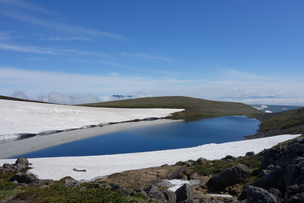大雪山・トムラウシ山の北側に広がる「北沼」。7月上旬でも沼の周辺には写真のように雪が残り、雪解け水をたたえている。数日間に渡る縦走の場合はこうした水に頼ることになるため、生水をどうやって安全に利用するかを想定しておく必要がある。