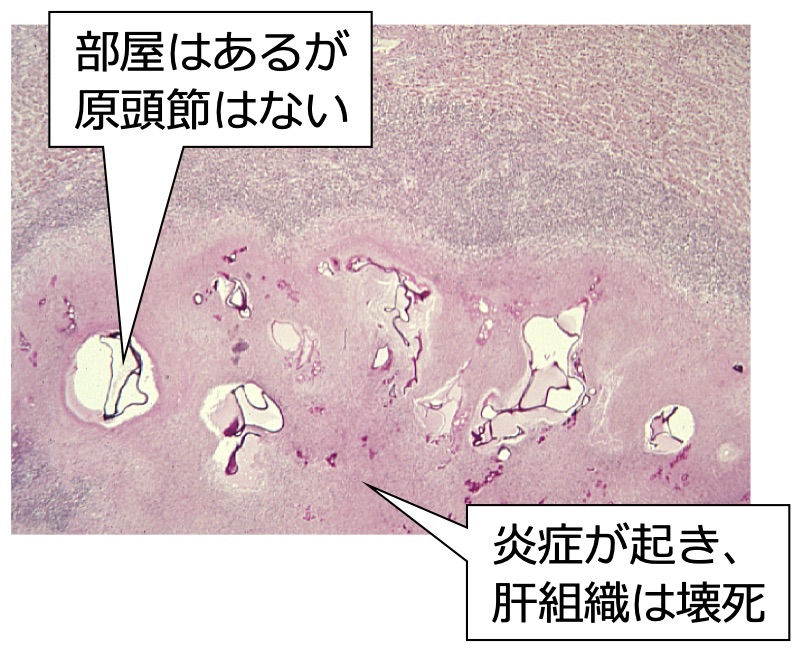 エキノコックスが寄生したヒトの肝臓。ヒトに寄生したエキノコックスの幼虫は、成虫になるための「原頭節(げんとうせつ)」という組織を作ることができないまま、ひたすら増殖を続ける。この過程で肝臓は炎症を起こして壊死していく。(画像提供:国立大学法人 旭川医科大学寄生虫学講座)