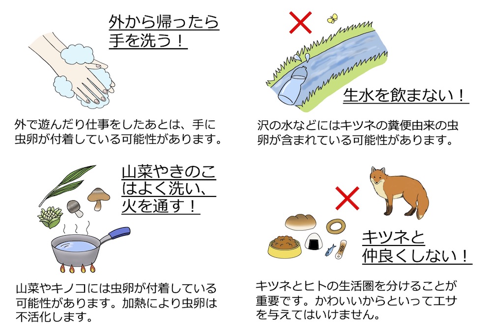 どう考えても罹るとやっかいなうえ、寄生のしかたがなんとも嫌らしい。治療法のことを考えると、予防策を徹底したほうがメリットは大きい。そこで北海道では、全道的にエキノコックスの感染を防ぐためにいくつかのポイント挙げて啓蒙活動をすすめている。
