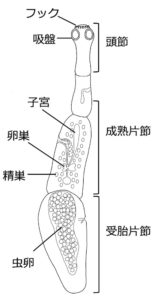 エキノコックスの成虫はキツネの小腸の壁にフック状のトゲで引っかかり、吸盤で吸い付いて栄養を得ている。苦手な人もいると思うので、その姿はスケッチ画で。(画像提供:国立大学法人 旭川医科大学寄生虫学講座)