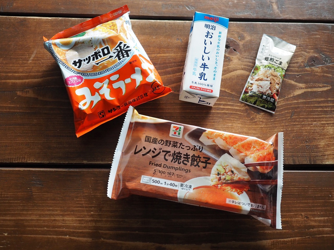 それと牛乳(豆乳でもOK)とサラダ用の小パックの焙煎ごまドレッシング。そして今回のキー食材は冷凍の餃子です。