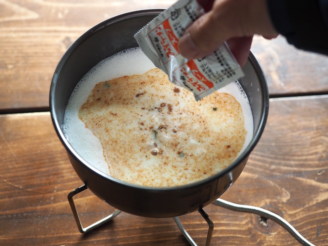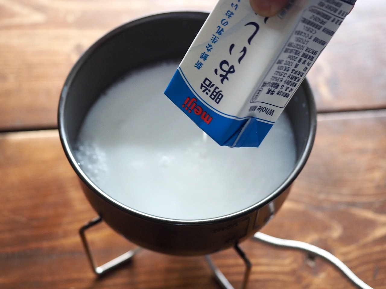 まずはコッヘルに牛乳全部と水300㏄を足して全部で500㏄にします。あ、だいたいでいいですよ。山ですし。