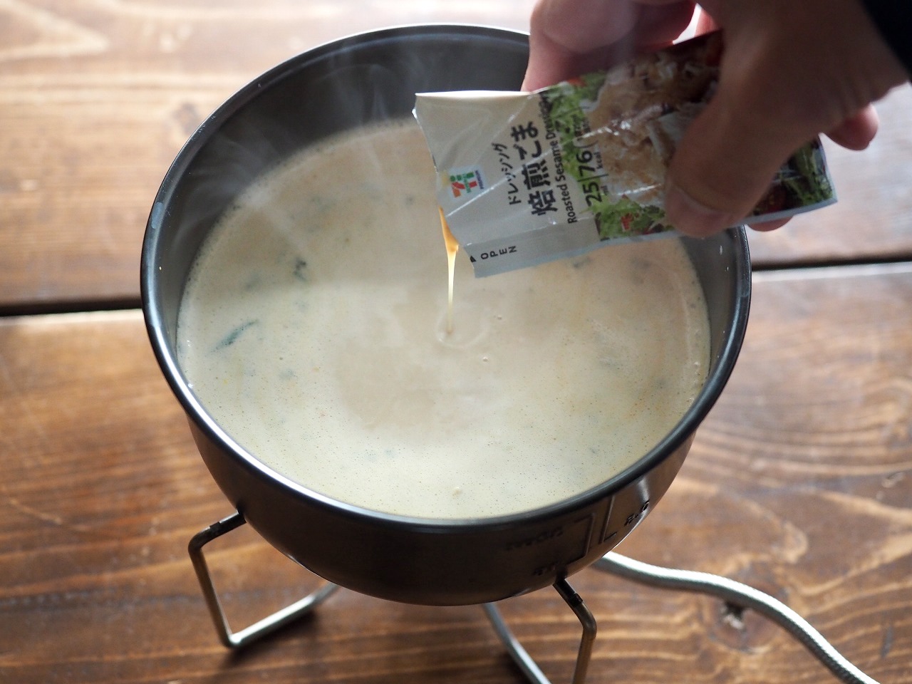 順番テキトーでイイやなんて言って味噌スープ入れる前にゴマドレ入れると……。